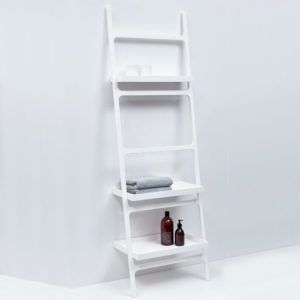 Handdoeken ladder wand bevestigd met drie planken in mat wit.
